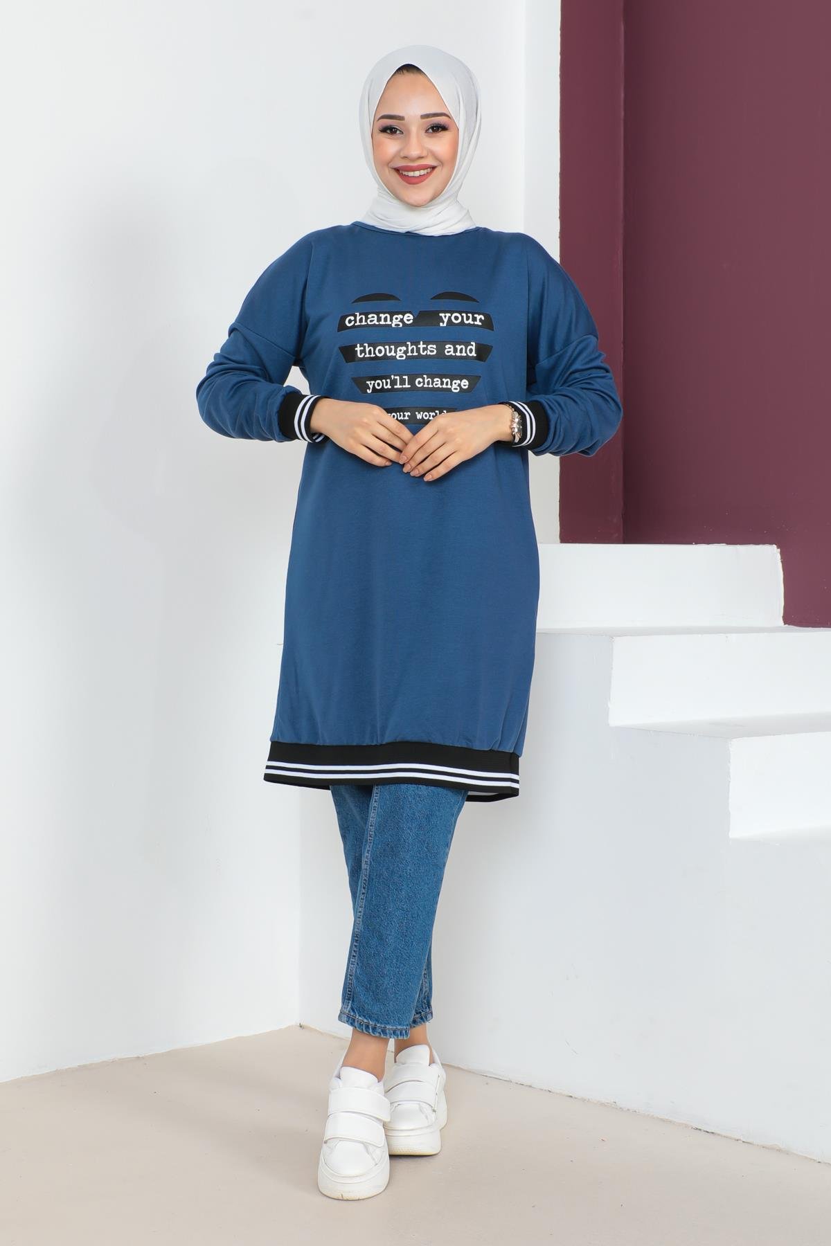 Baskılı Ribana Detay Tesettür Tunik-İndigo (AFM0013-6)